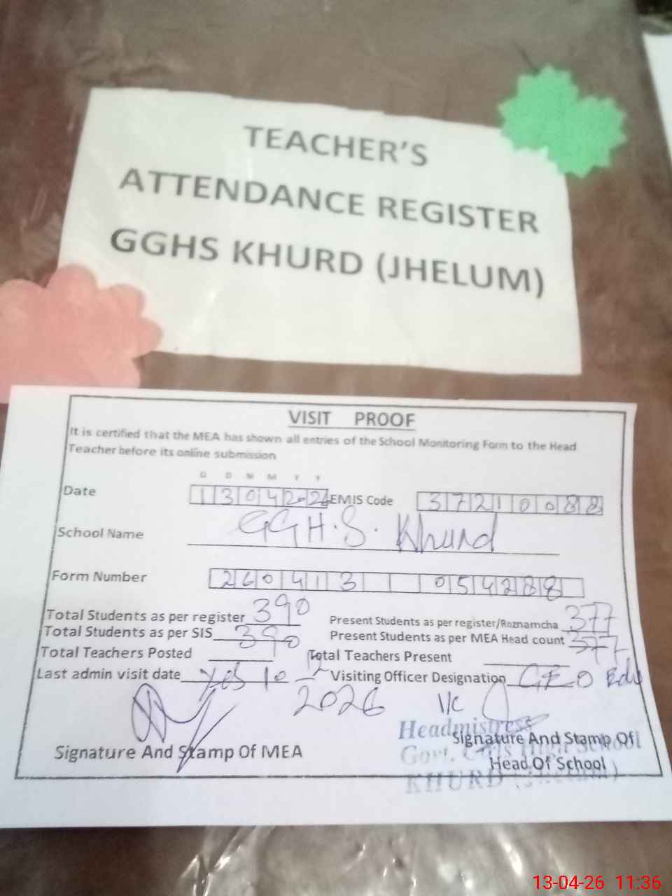 | Attendance Register | Head Teacher | MEA with School | Visit Proof |