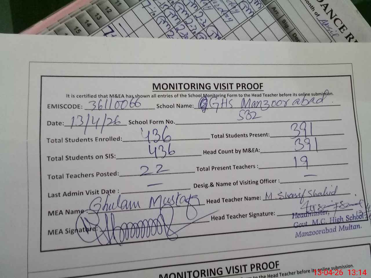 | Attendance Register | Head Teacher | MEA with School | Visit Proof |