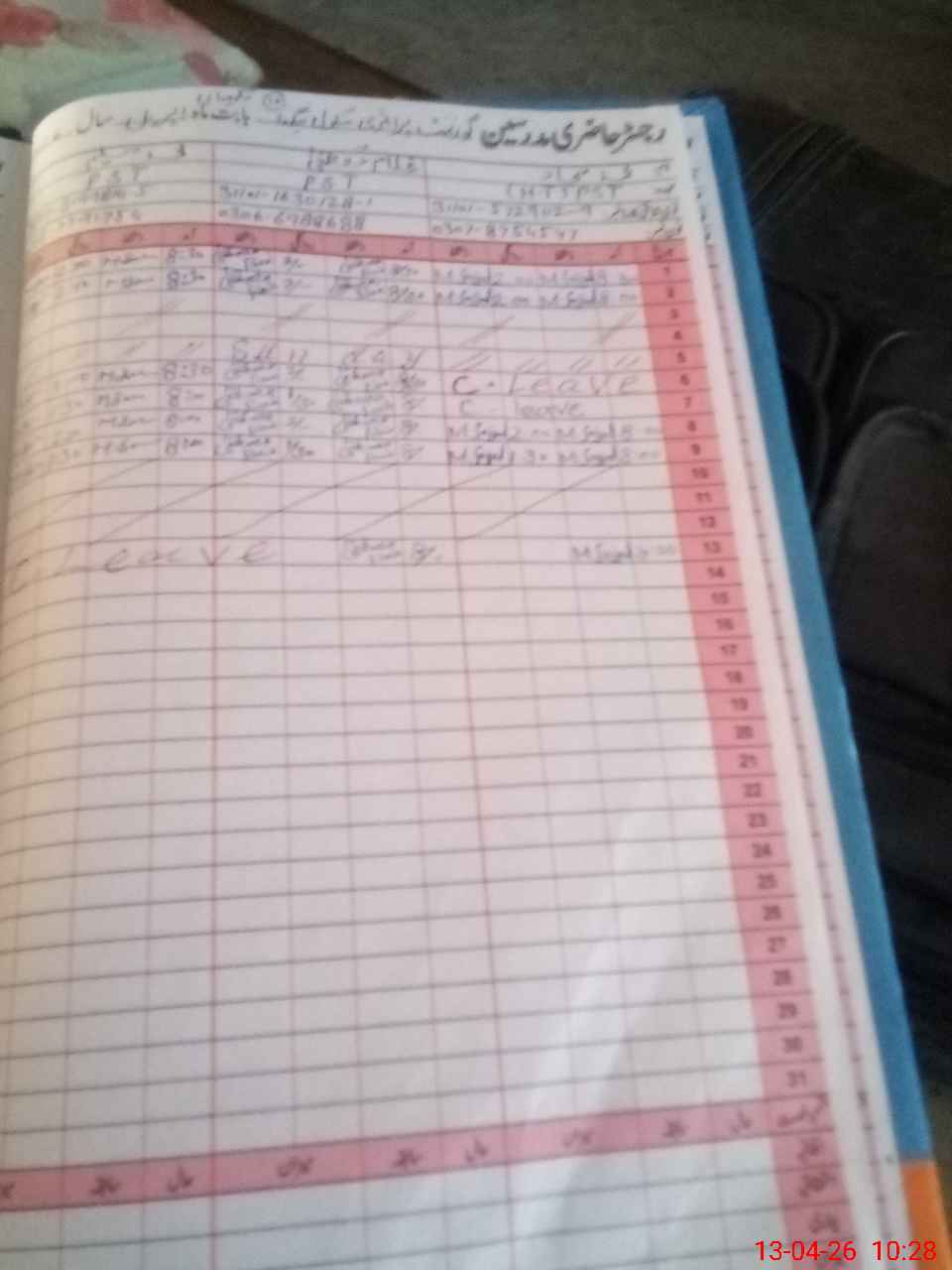 | CNIC | Full Name | Designation | R/C | Absence During Last Calender Month |