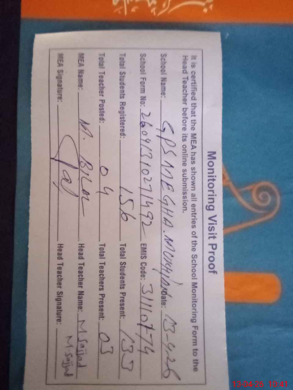 | Attendance Register | Head Teacher | MEA with School | Visit Proof |