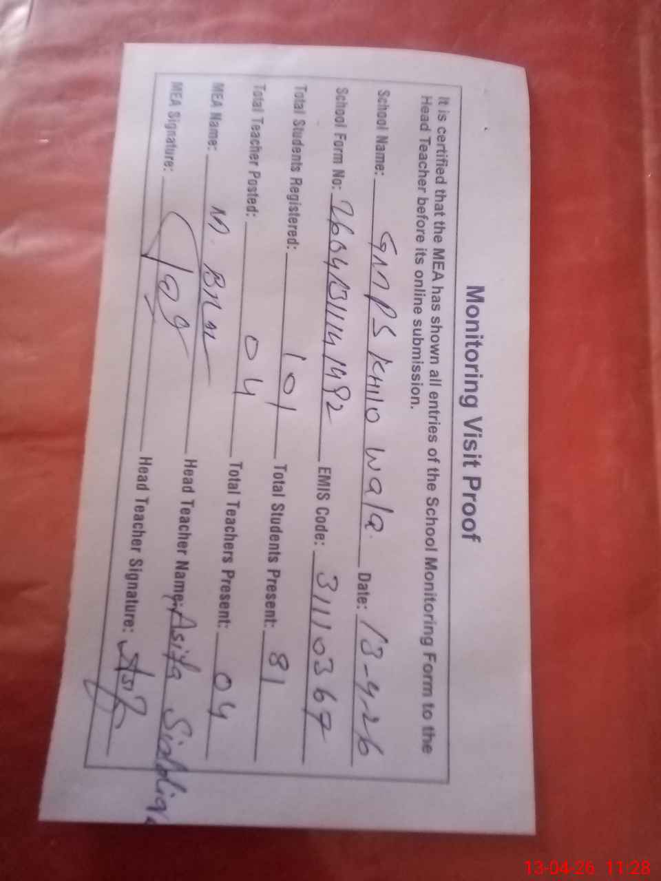 | Attendance Register | Head Teacher | MEA with School | Visit Proof |