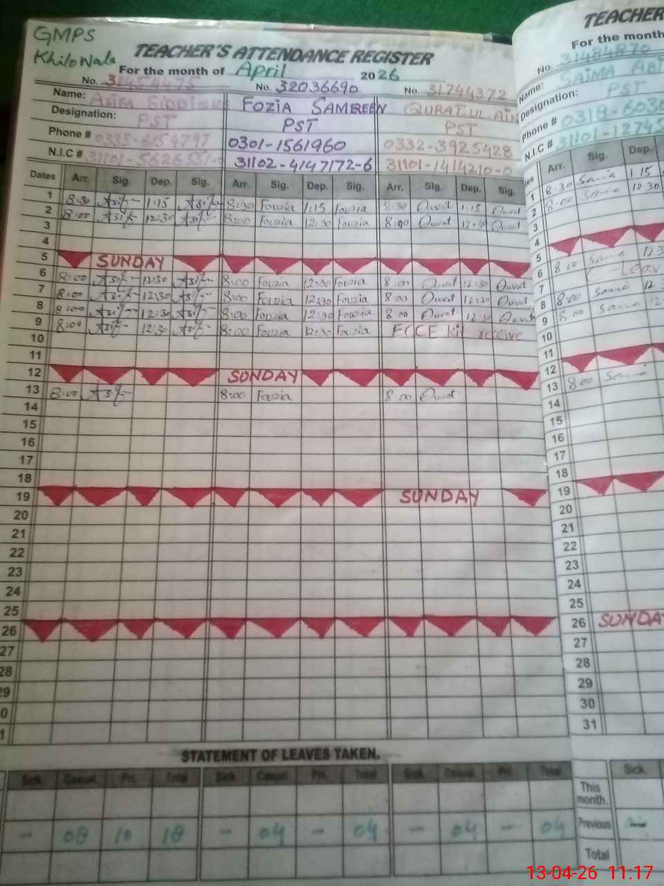 | CNIC | Full Name | Designation | R/C | Absence During Last Calender Month |