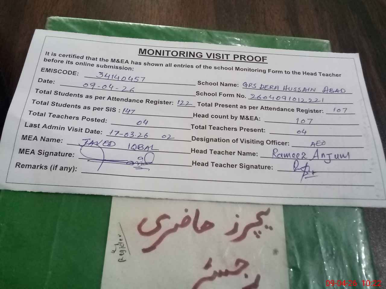 | Attendance Register | Head Teacher | MEA with School | Visit Proof |