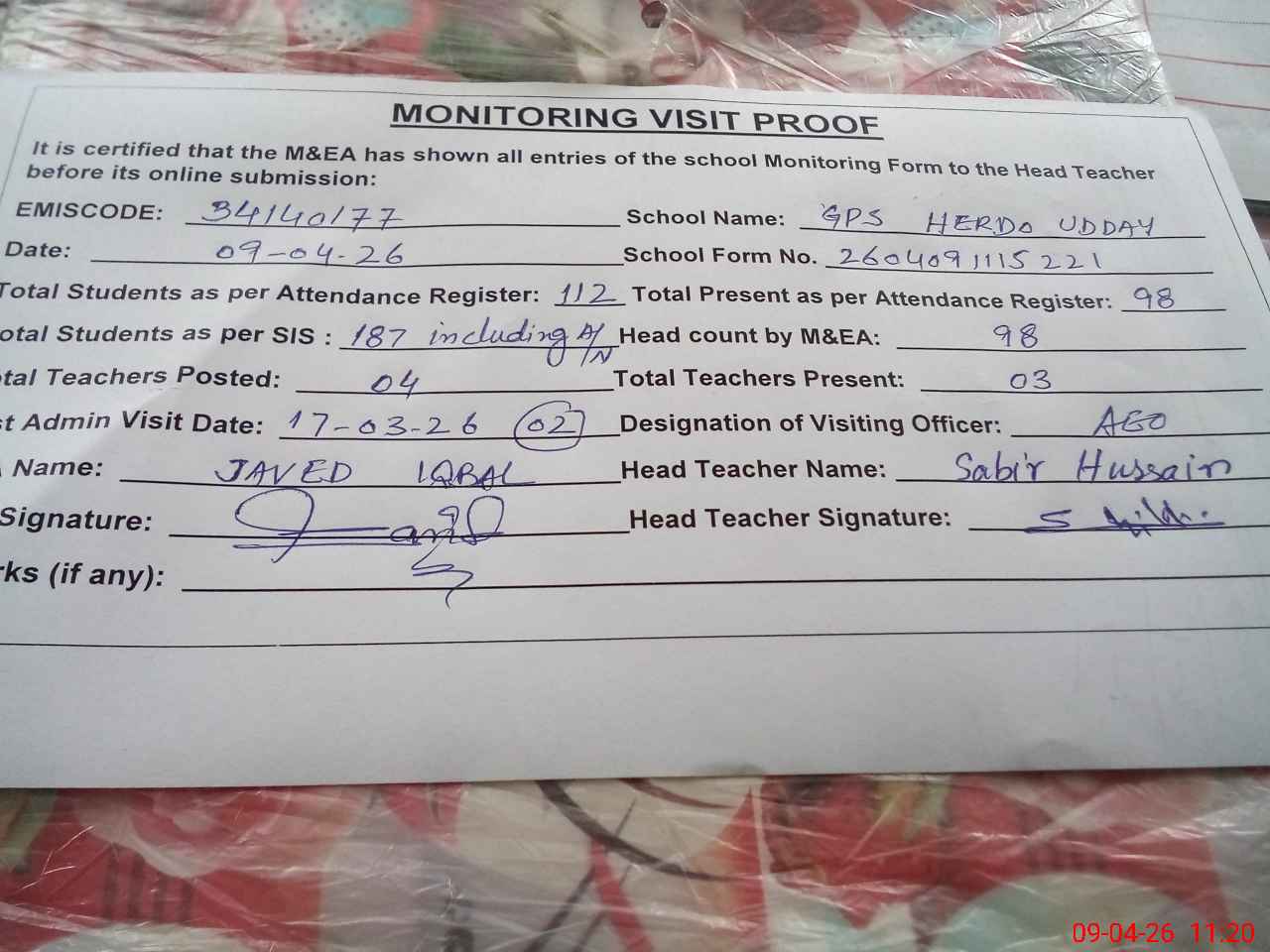 | EMIS Code: 34140177 | Name of School: GPS HERDO UDDAY | |||