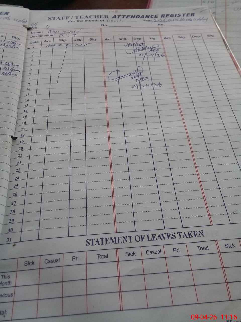 | 34**** | Ab**** Za**** | ESE (Arts) | Contract | 0 | 0 | 31 | 0 | 0 | 0 | 0 | 0 | 0 | Absent (Un-Authorized) |