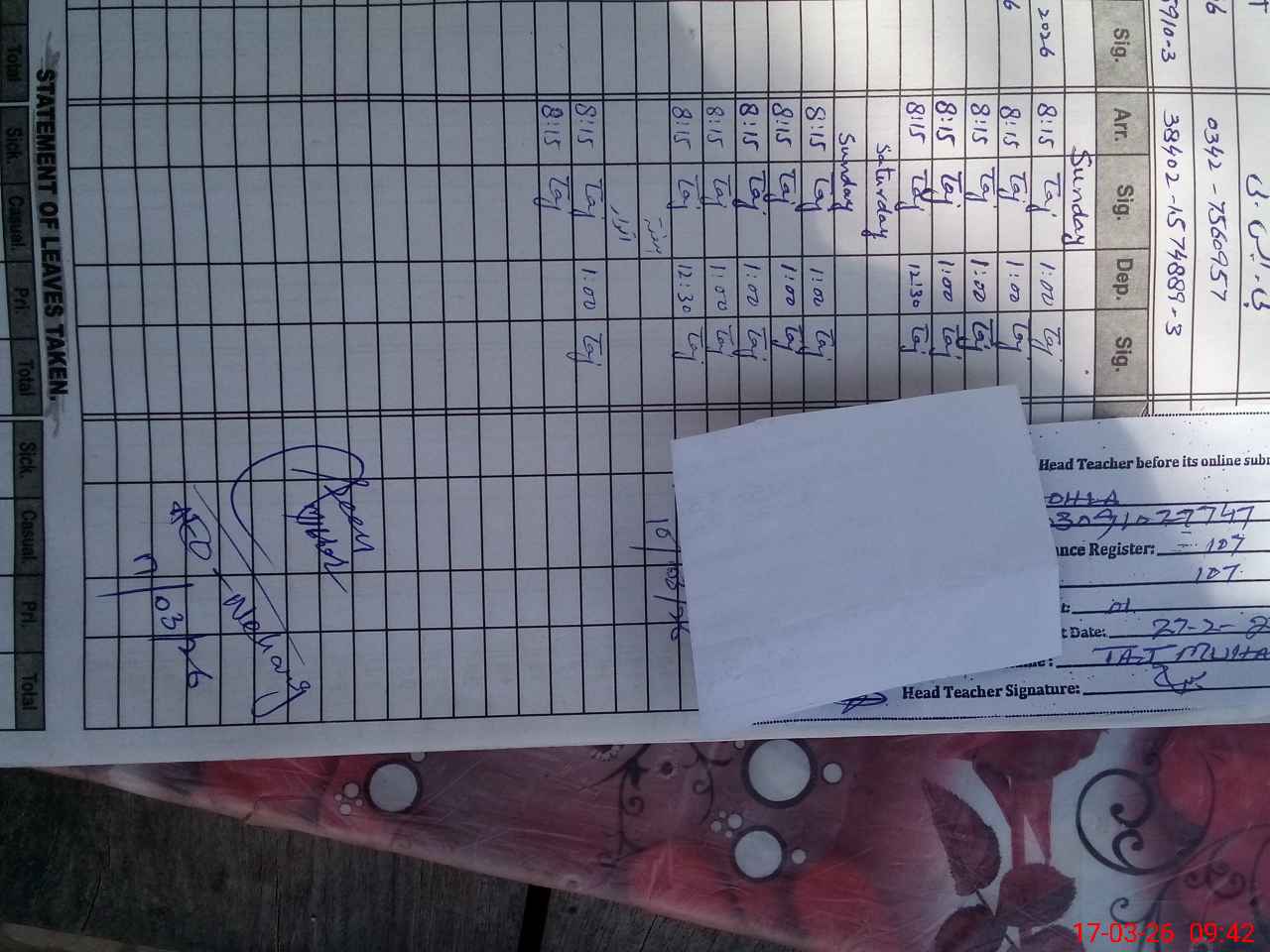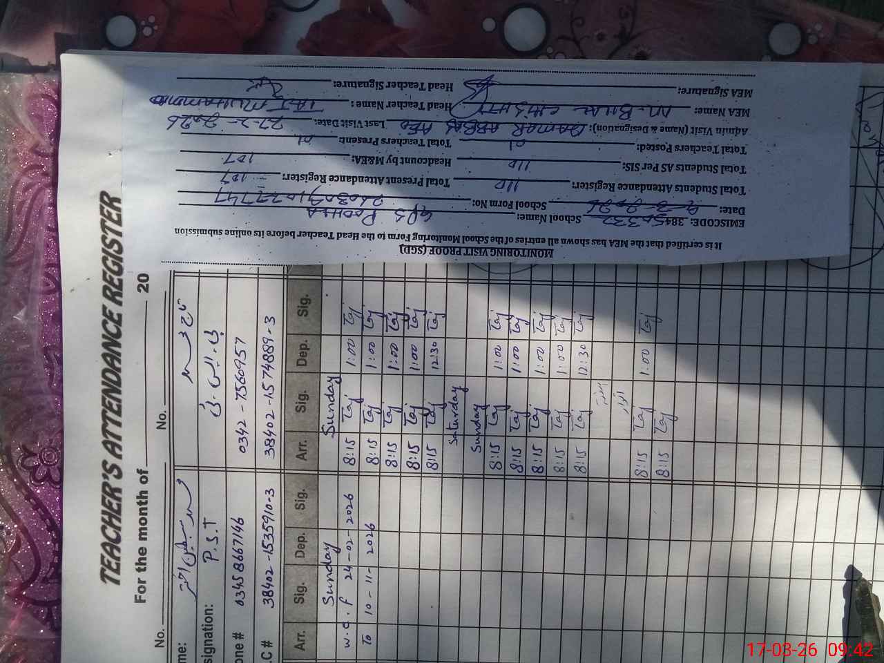 | Name: MU**** SI**** Designation: (School Headmaster's/Headmistress's) PTC/JV Phone/Cell Number: 03**** |