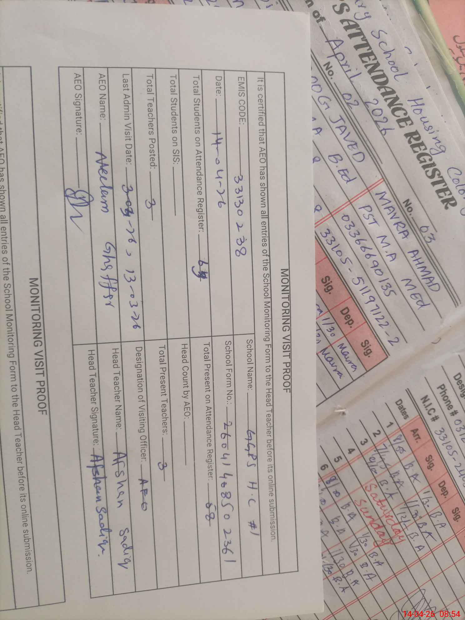 | Attendance Register | Head Teacher | MEA with School | Visit Proof |
