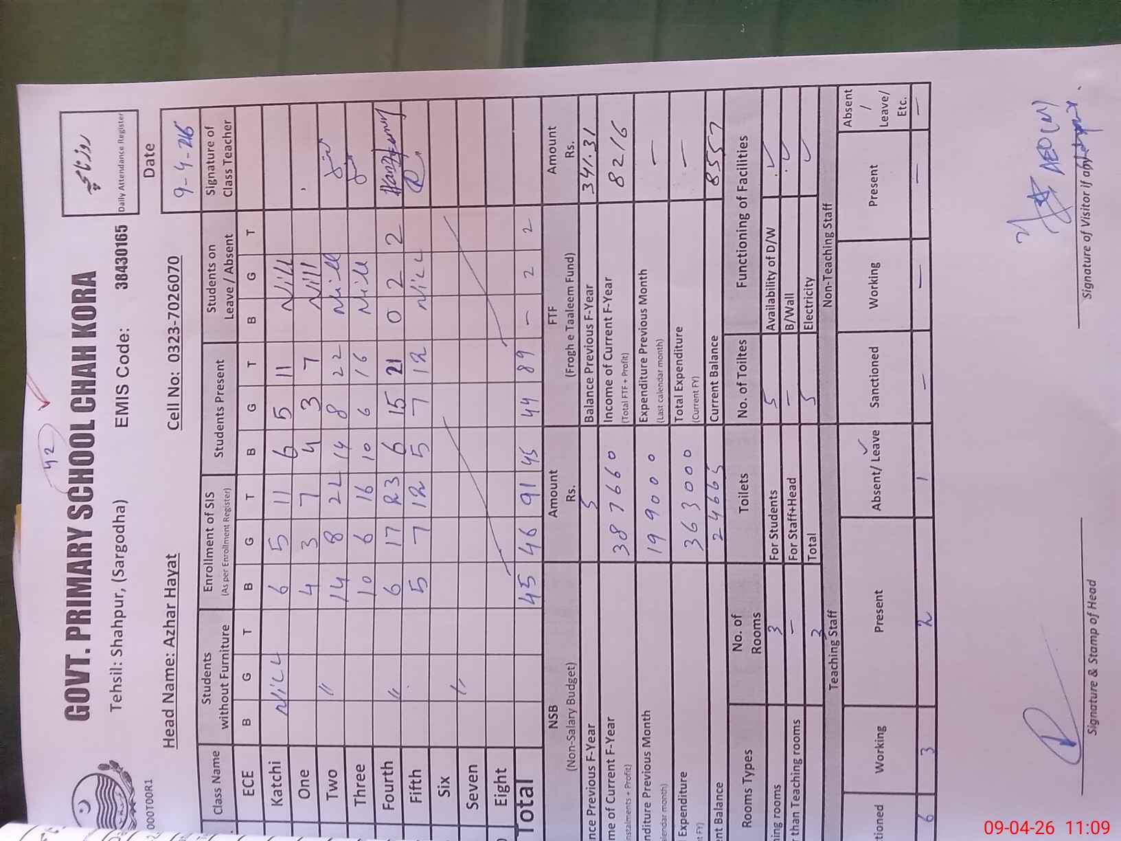 | Attendance Register | Head Teacher | MEA with School | Visit Proof |