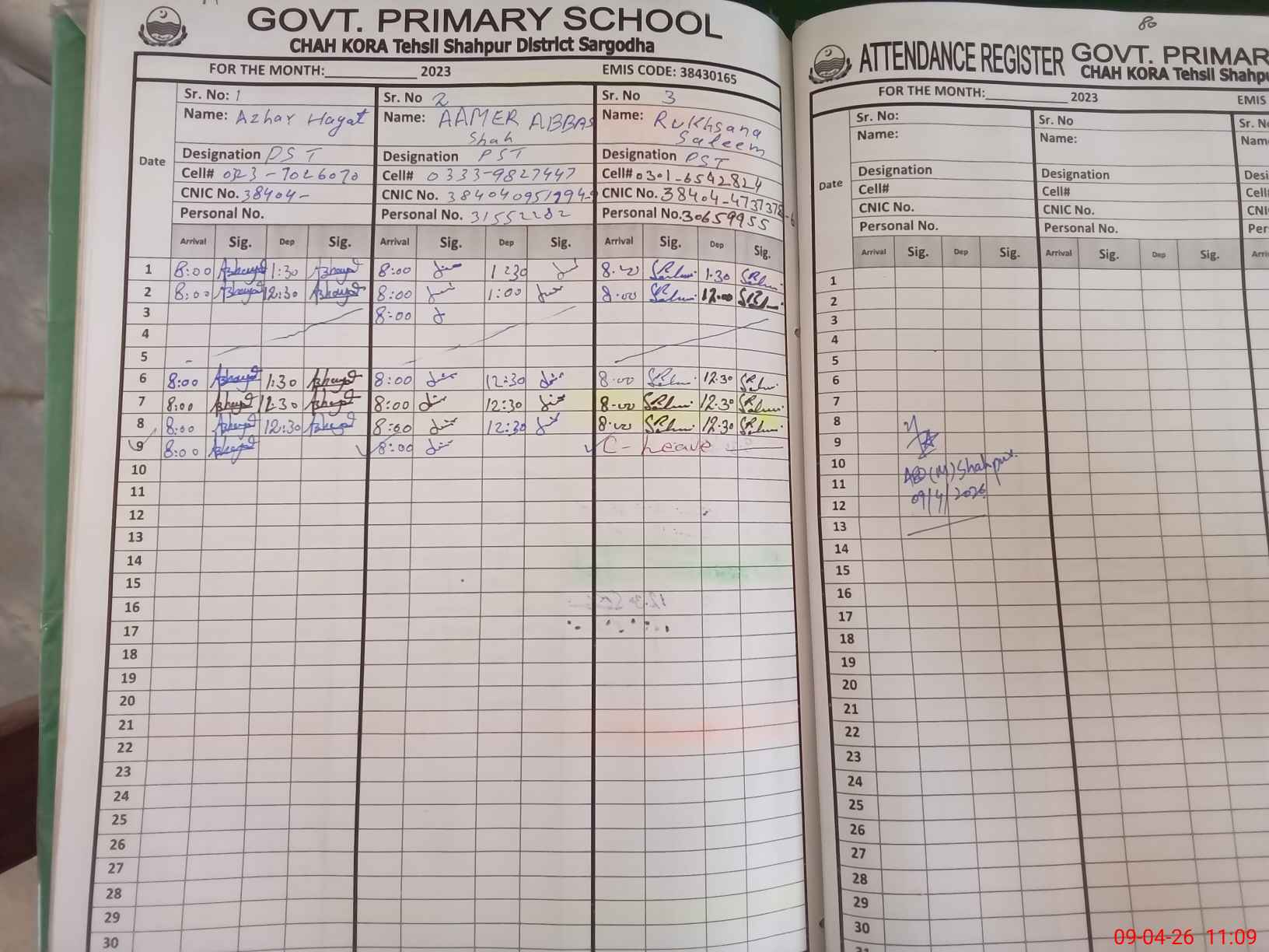 | Name: AZ**** HA**** Designation: (School Headmaster's/Headmistress's) PST Phone/Cell Number: 03**** |