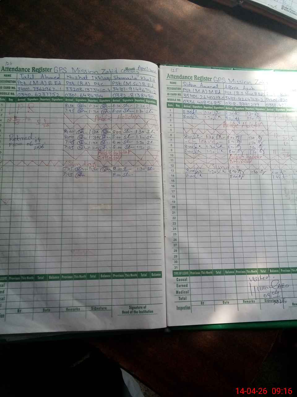 | CNIC | Full Name | Designation | R/C | Absence During Last Calender Month |