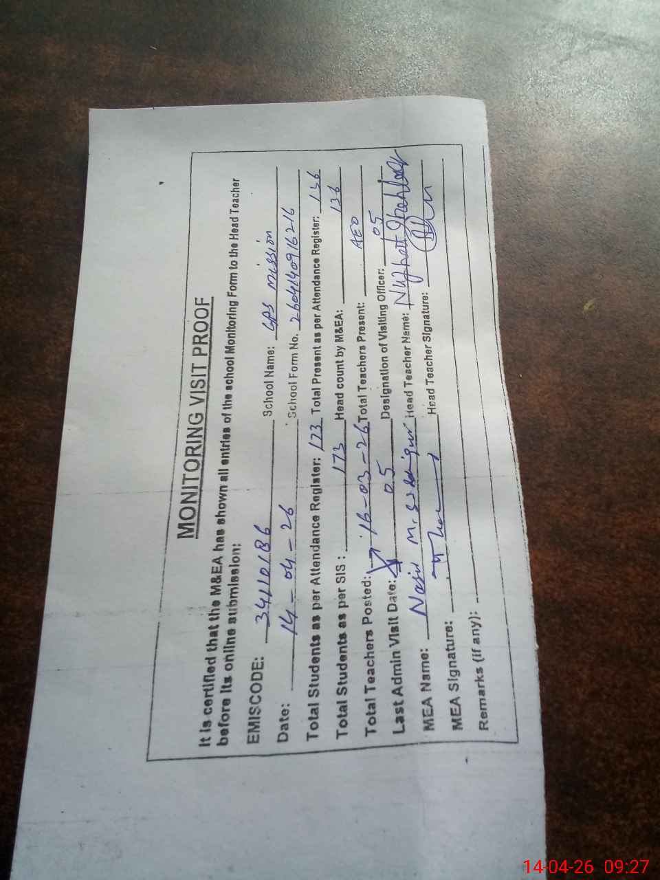 | Attendance Register | Head Teacher | MEA with School | Visit Proof |