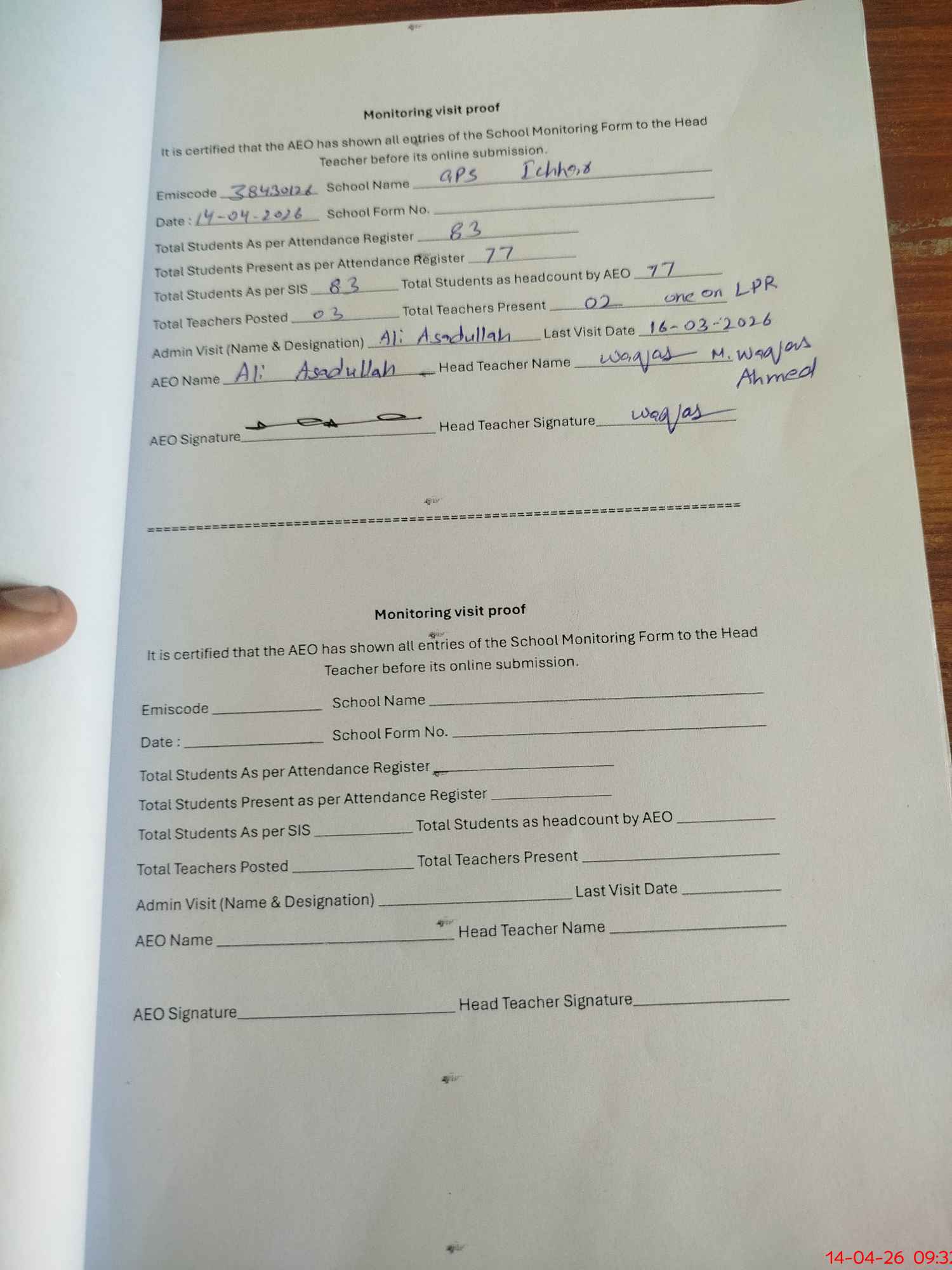 | Attendance Register | Head Teacher | MEA with School | Visit Proof |