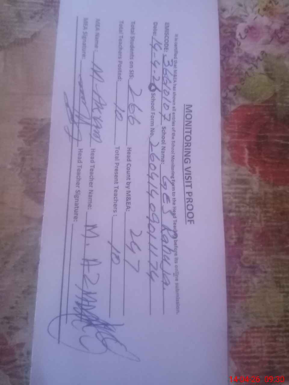 | Attendance Register | Head Teacher | MEA with School | Visit Proof |