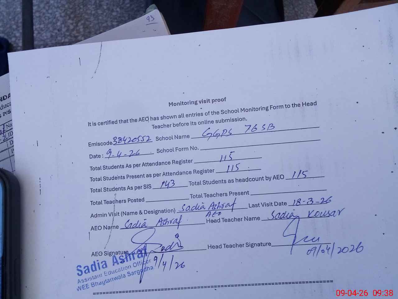 | Attendance Register | Head Teacher | MEA with School | Visit Proof |