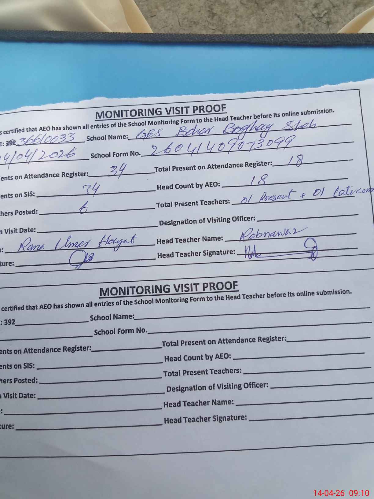 | Attendance Register | Head Teacher | MEA with School | Visit Proof |