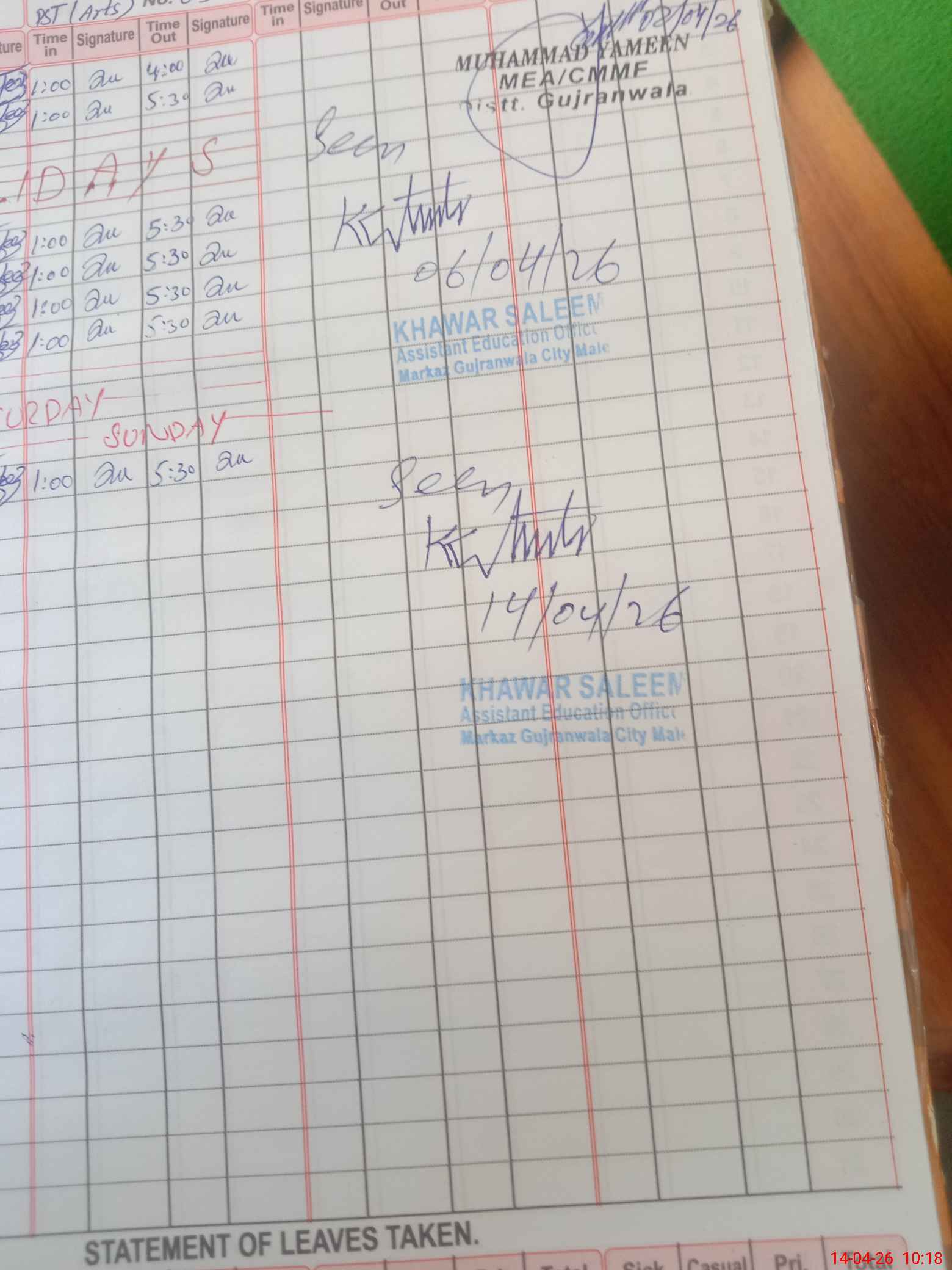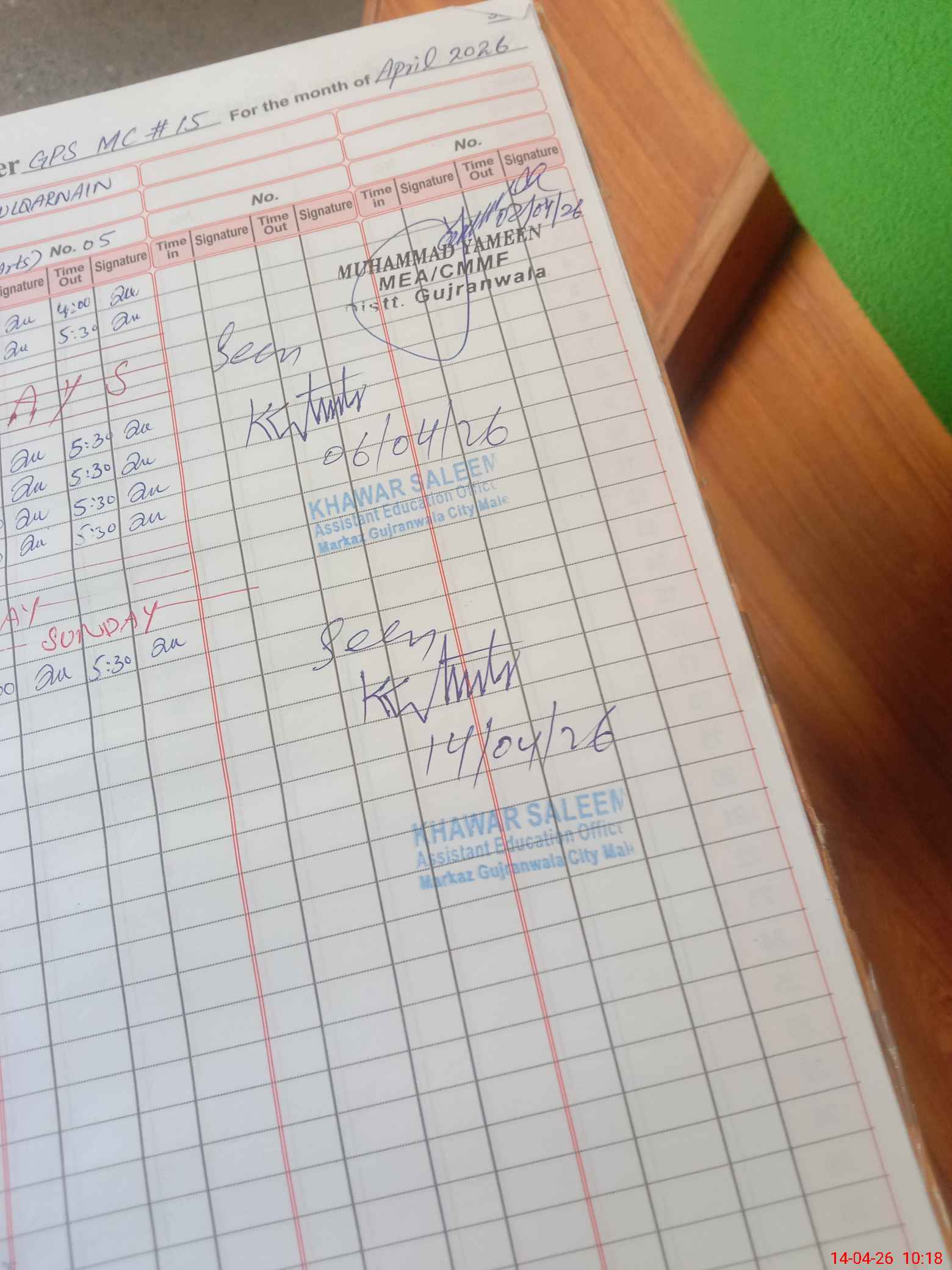 | Monitoring Date: 14-04-2026 | Start Time: 14-04-2026 10:12 AM | End Time: 14-04-2026 10:18 AM | Name of MEA: Kh**** Sa**** | |