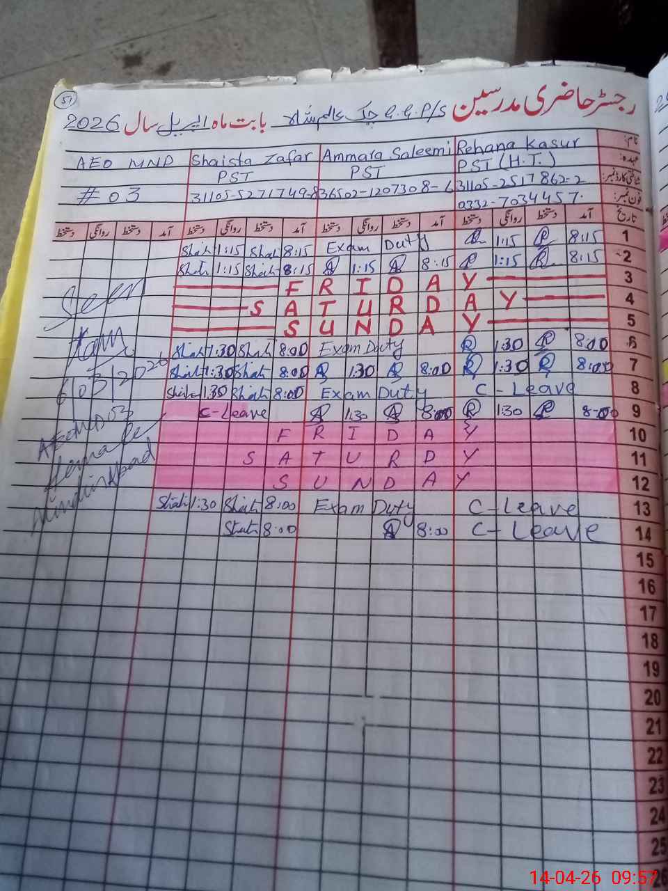 | Remarks (Use Separate Page if Required): PST Rehana Kouser cinc 3110525178622 is found absent with out any official proof document | |||||