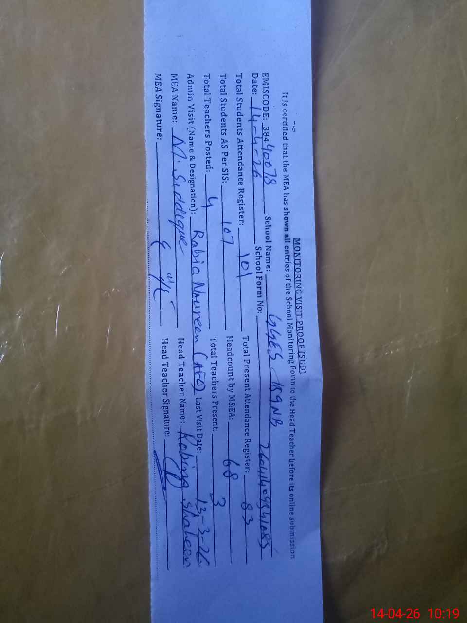 | Attendance Register | Head Teacher | MEA with School | Visit Proof |