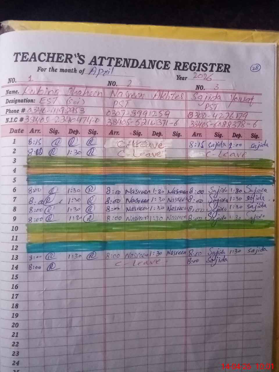| CNIC | Full Name | Designation | R/C | Absence During Last Calender Month |