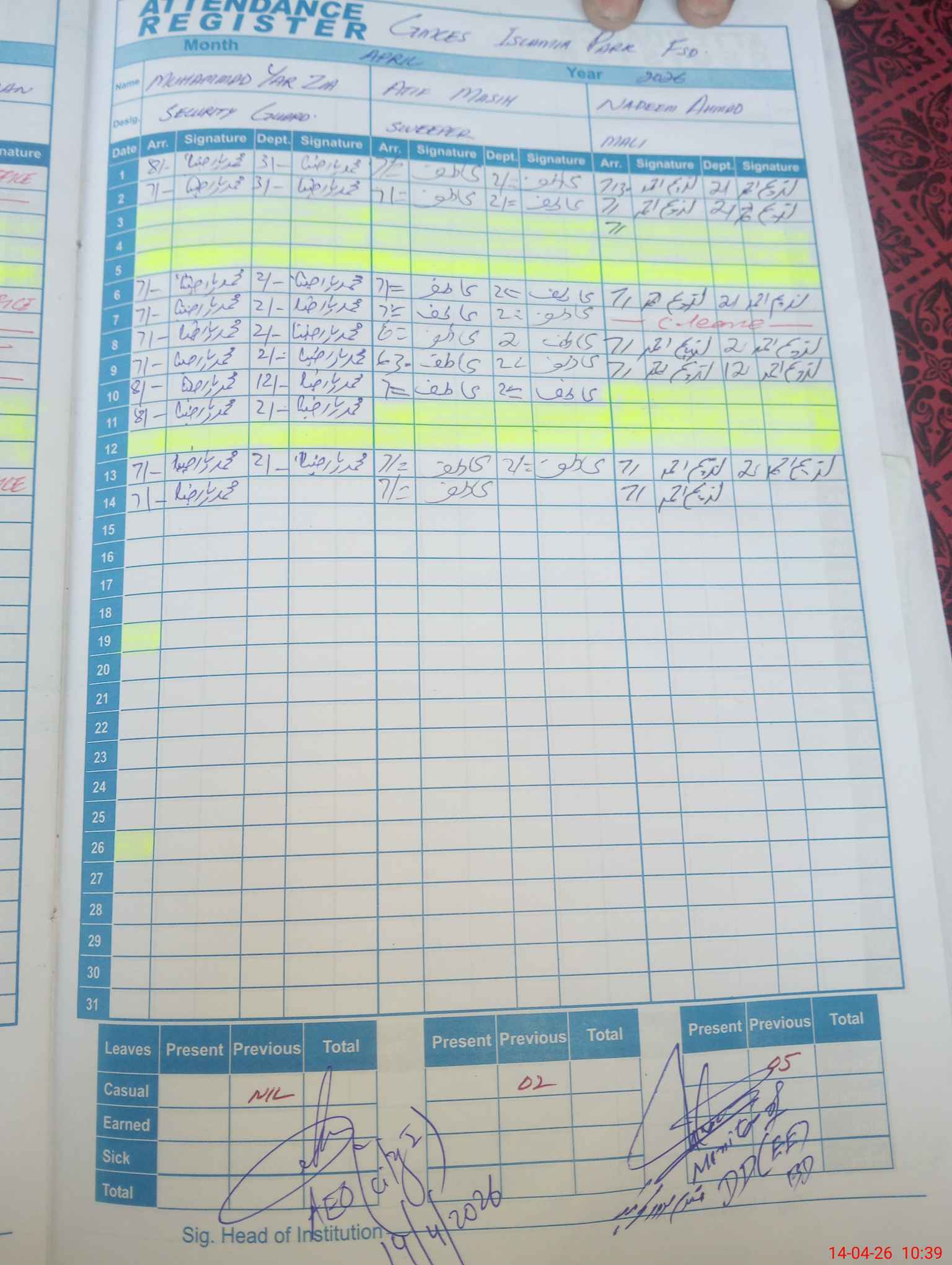 | CNIC | Full Name | Designation | R/C | Absence During Last Calender Month |