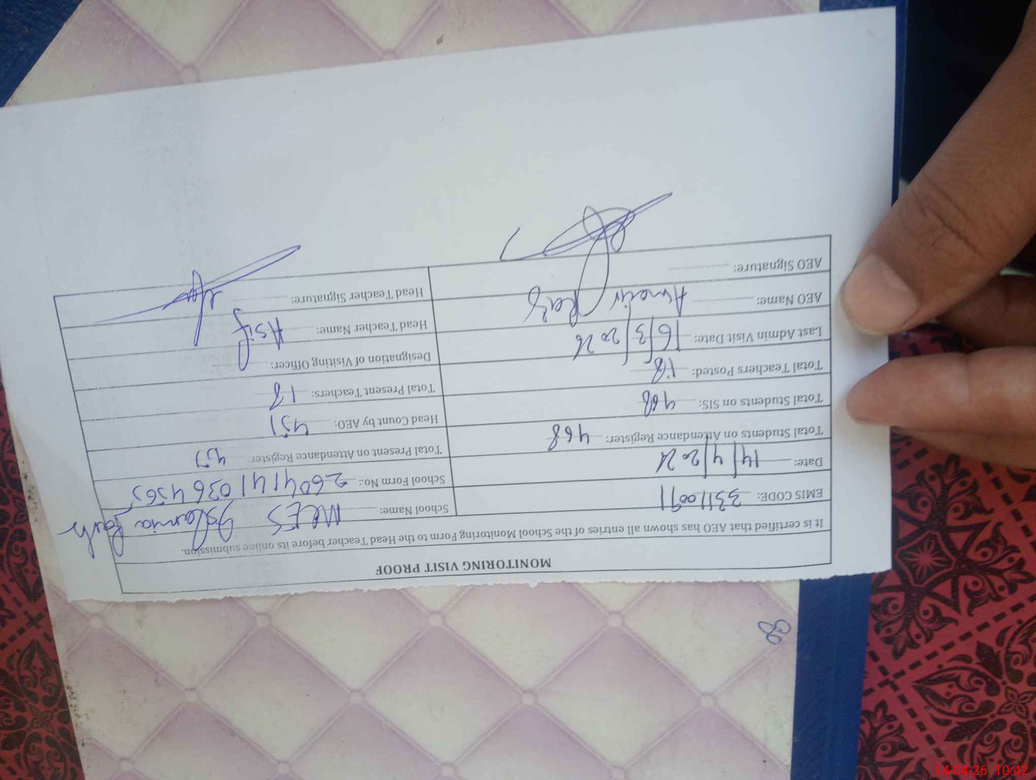| Attendance Register | Head Teacher | MEA with School | Visit Proof |