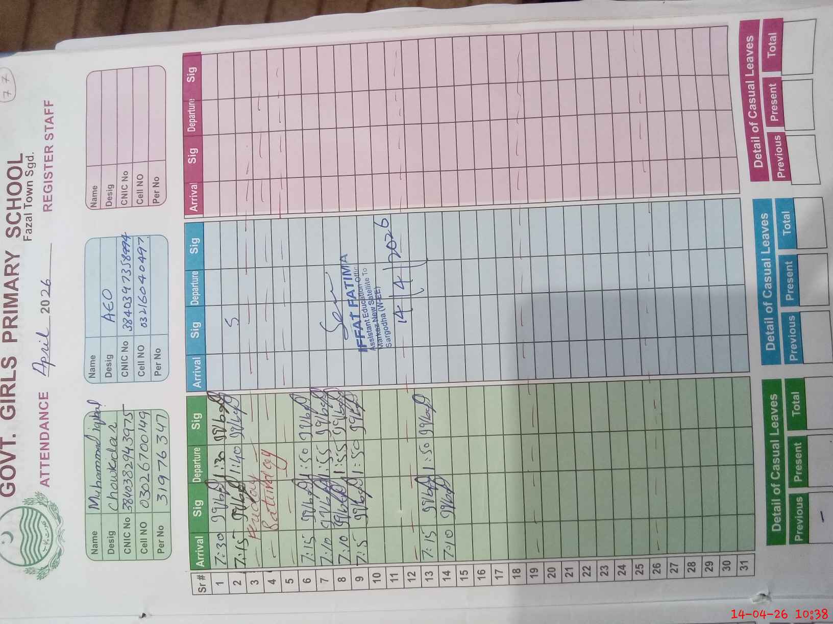 | CNIC | Full Name | Designation | R/C | Absence During Last Calender Month |