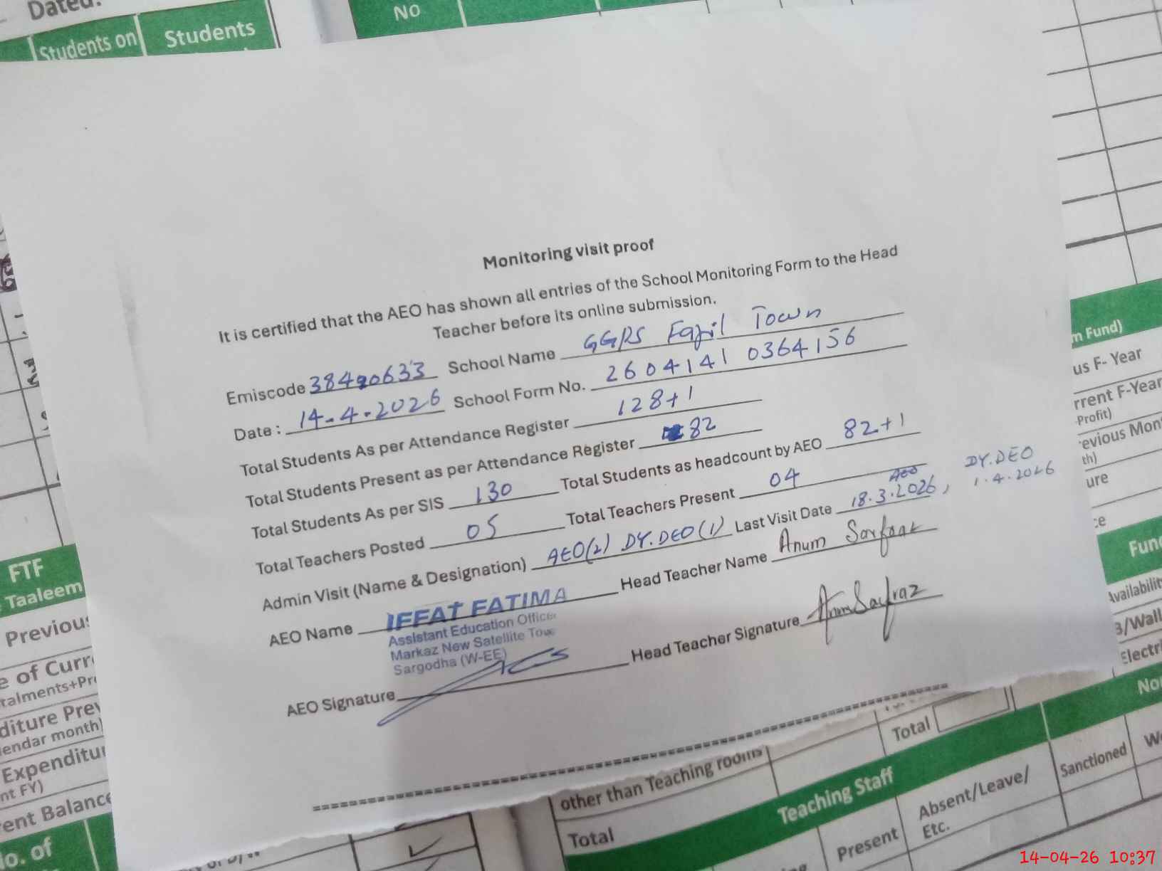 | Attendance Register | Head Teacher | MEA with School | Visit Proof |