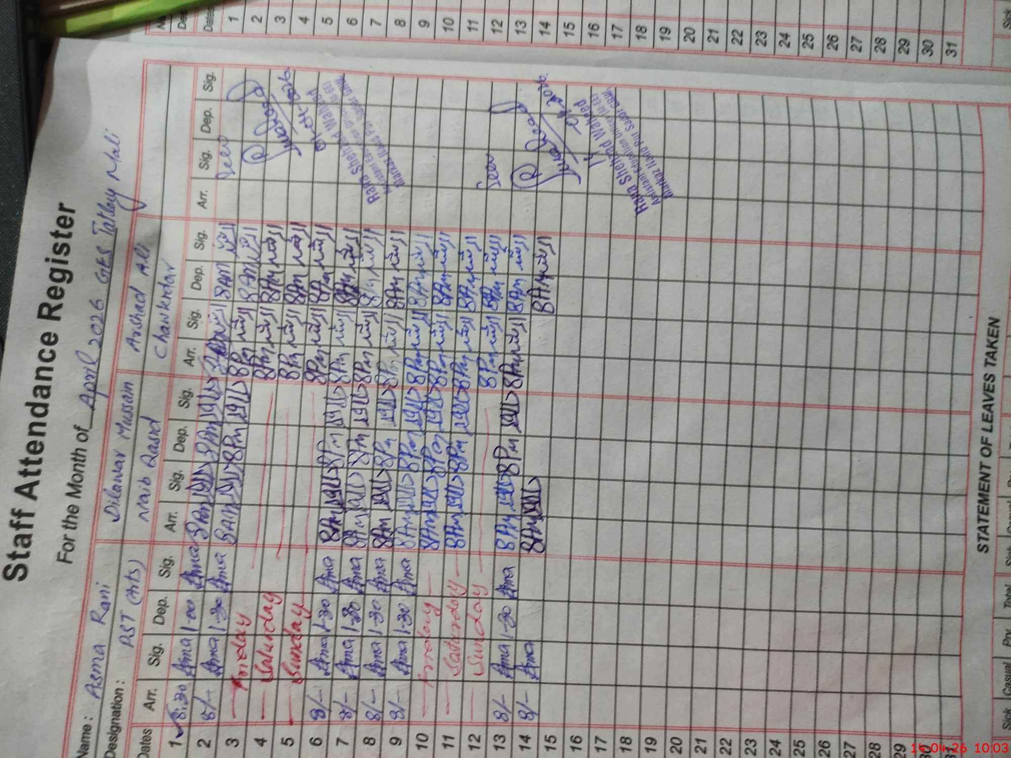 | Leave | Duty | Absent | Maternity | Medical | Ex- Pak |