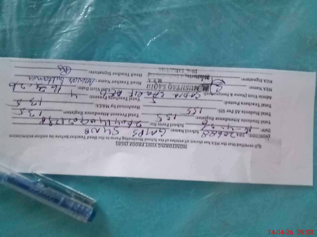 | Attendance Register | Head Teacher | MEA with School | Visit Proof |
