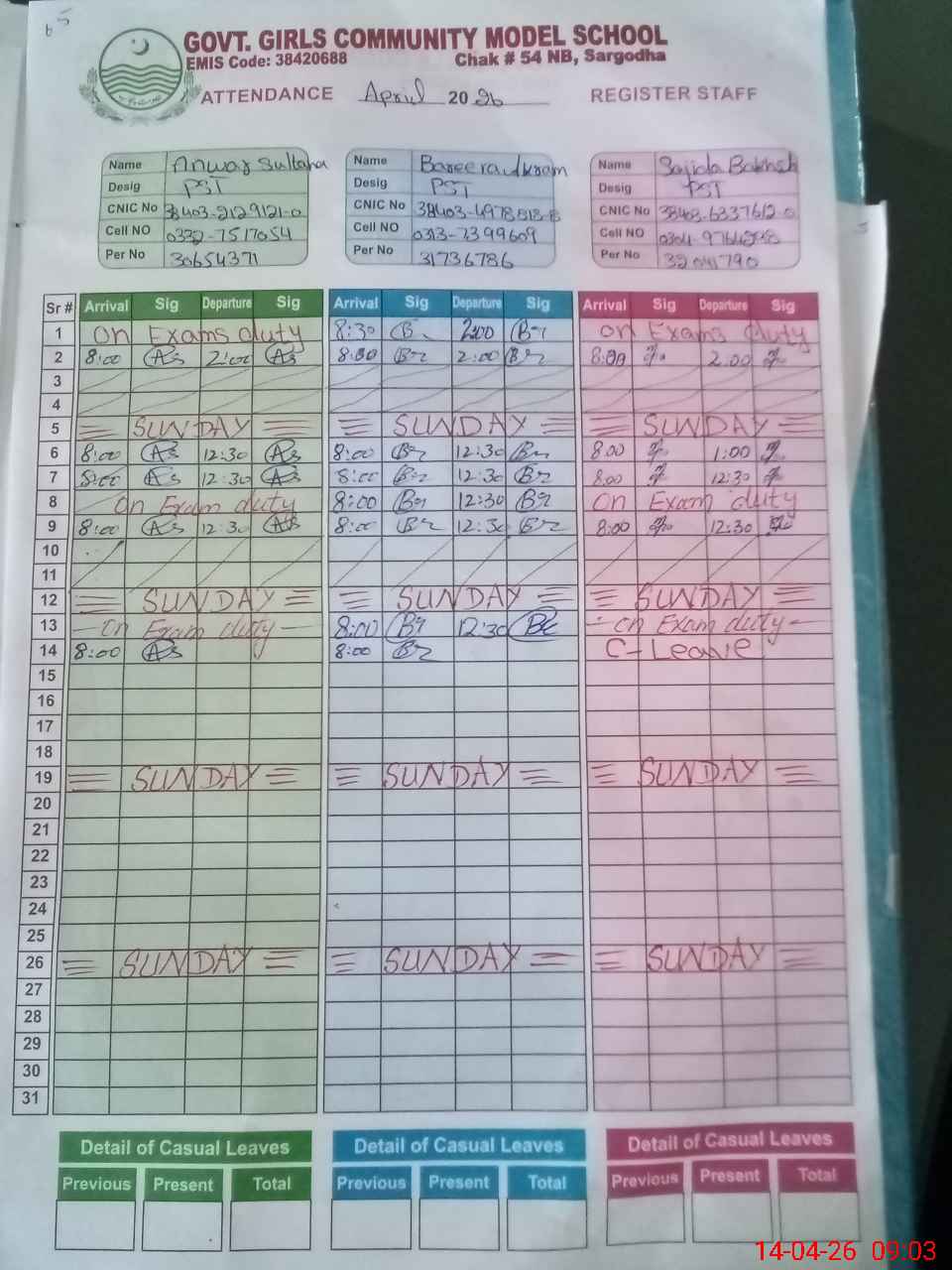 | 38**** | Sa**** Ba**** | PST Science/Maths | Regular | 0 | 0 | 0 | 0 | 0 | 0 | 0 | 0 | 0 | Casual |