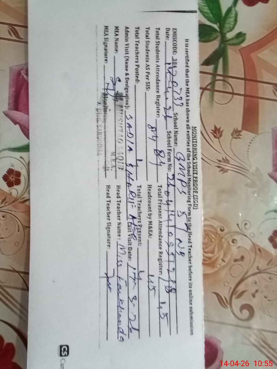 | Certified that this School was Inspected by the Undersigned MEA/DMO Today and the Information Stated Above is as Per Record. | |||||