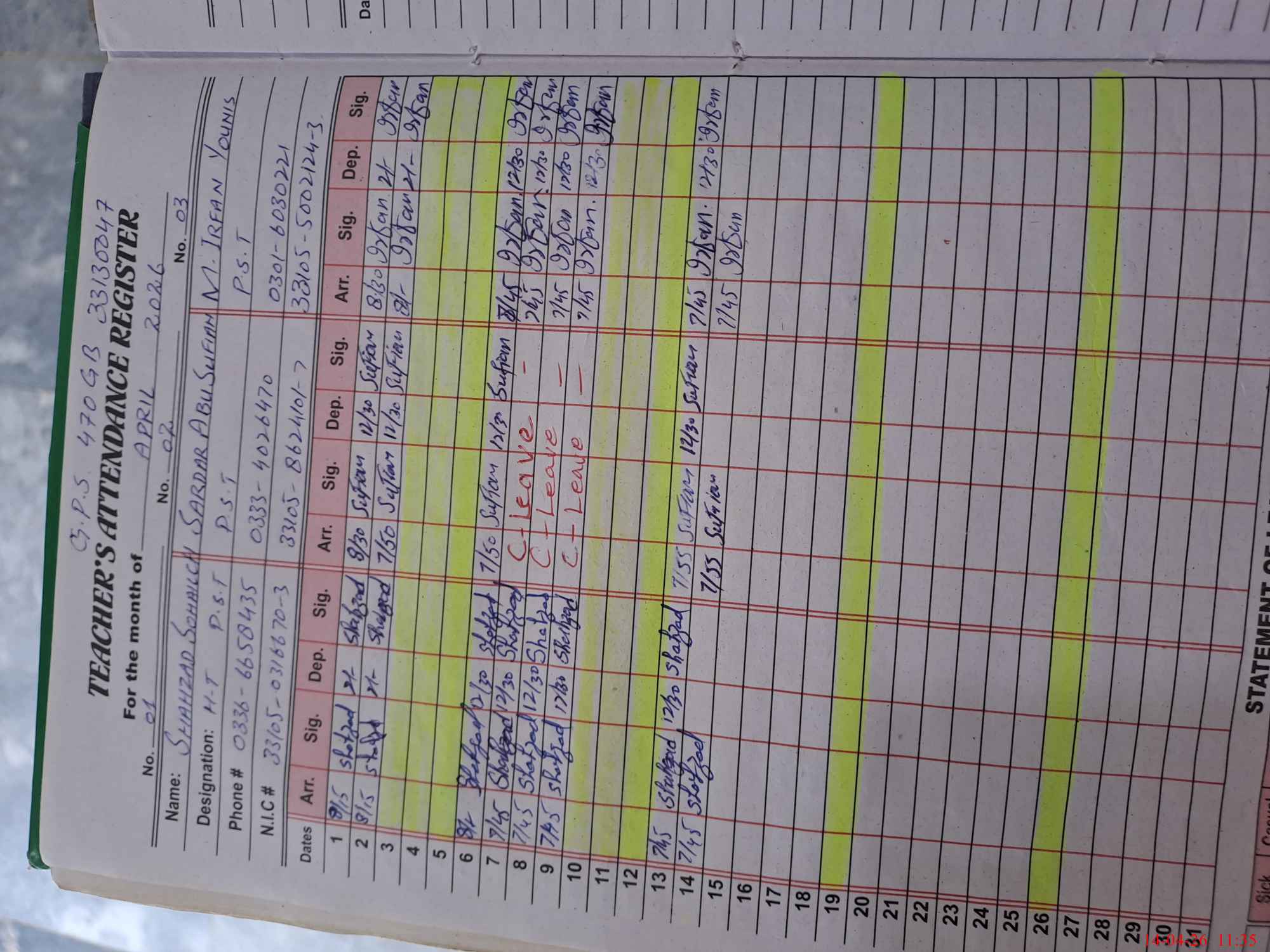 | CNIC | Full Name | Designation | R/C | Absence During Last Calender Month |