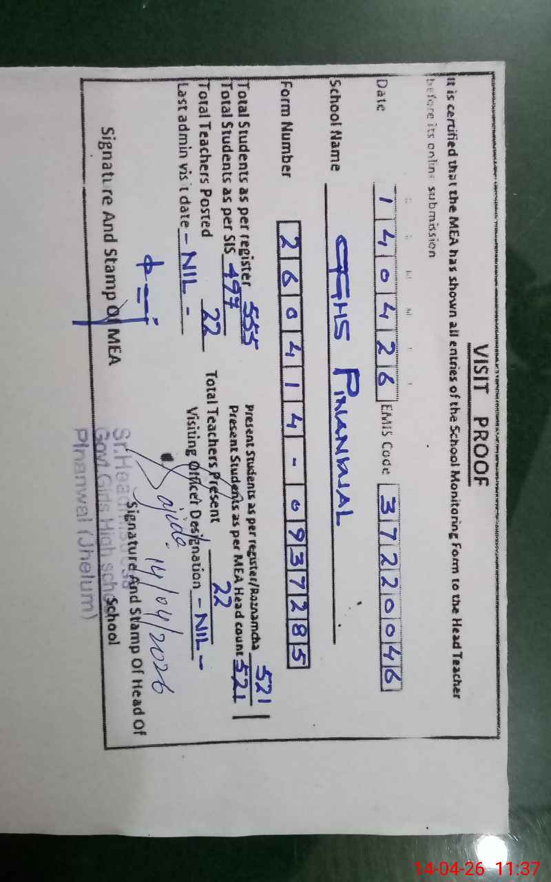 | EMIS Code: 37220046 | Name of School: GGHS PINAN WAL | |||