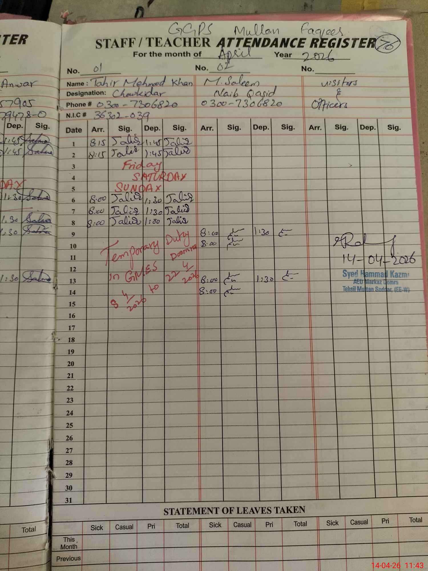 | CNIC | Full Name | Designation | R/C | Absence During Last Calender Month |