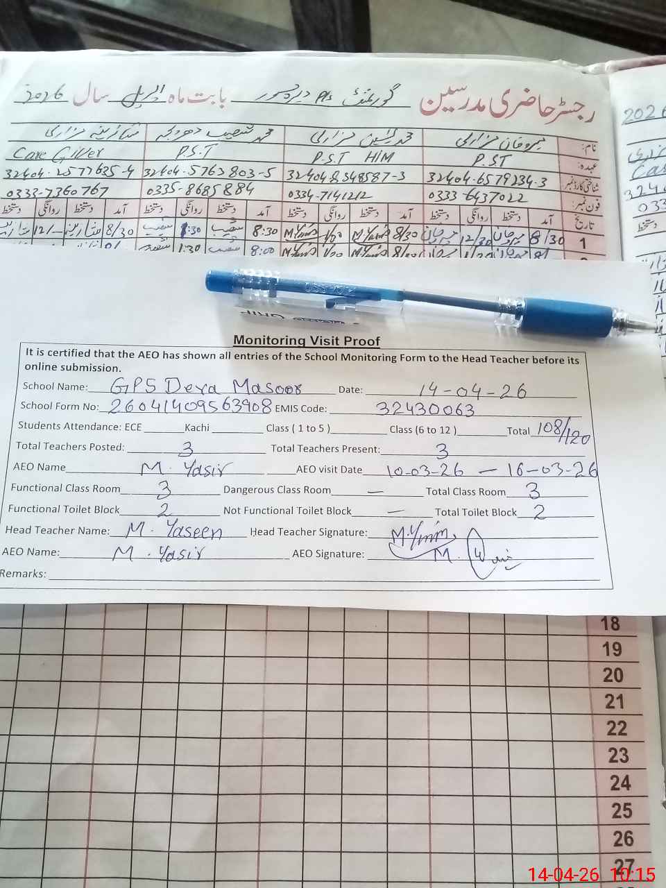 | EMIS Code: 32430063 | Name of School: GPS DERA MASOOR | |||