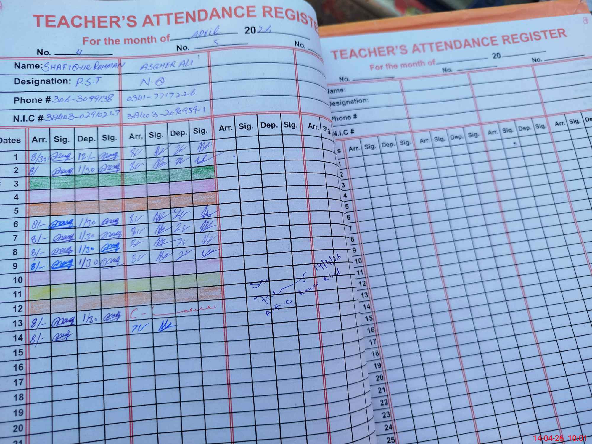 | CNIC | Full Name | Designation | R/C | Absence During Last Calender Month |