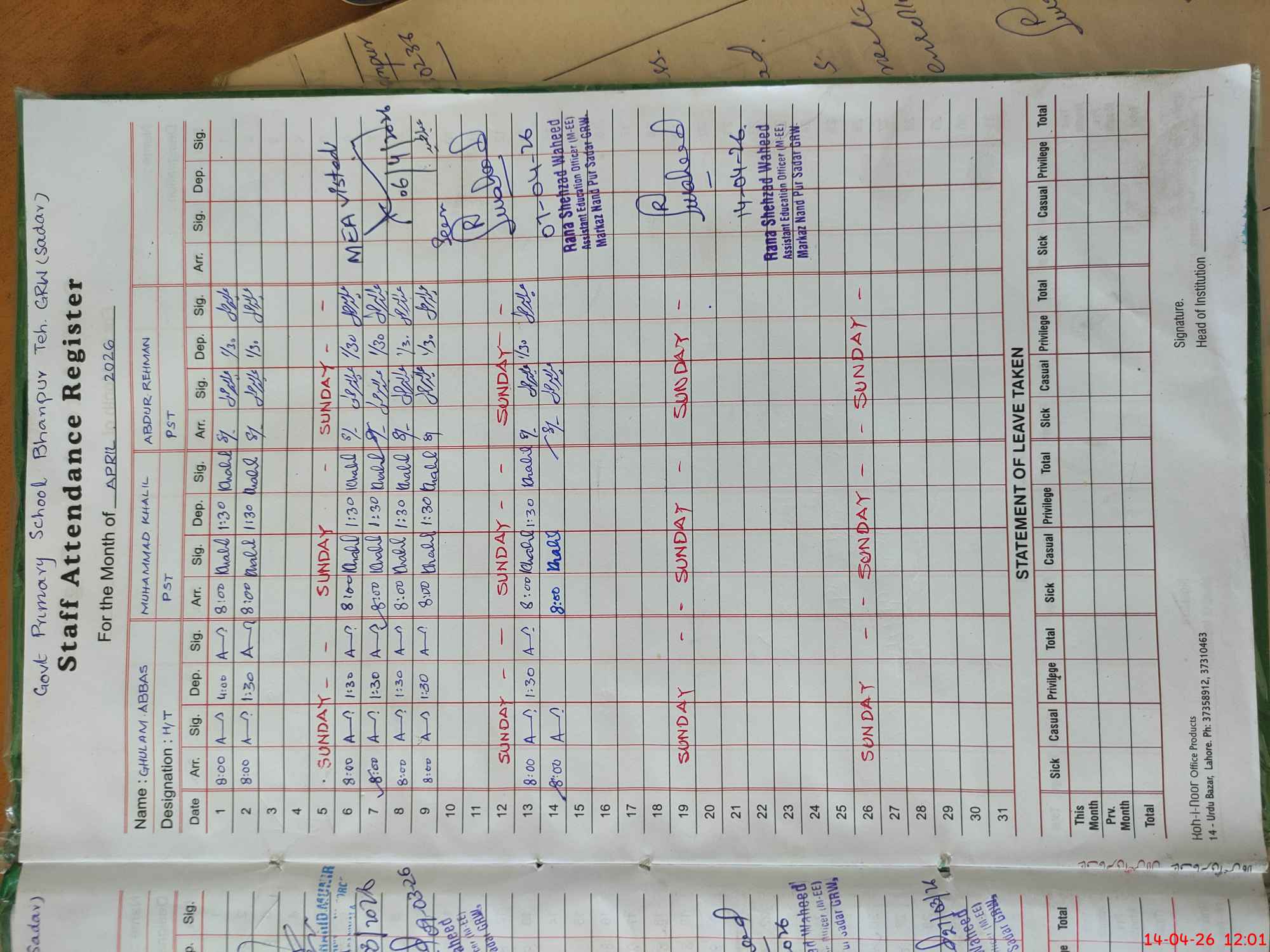 | Name: GH**** AB**** Designation: (School Headmaster's/Headmistress's) PST Phone/Cell Number: 03**** |