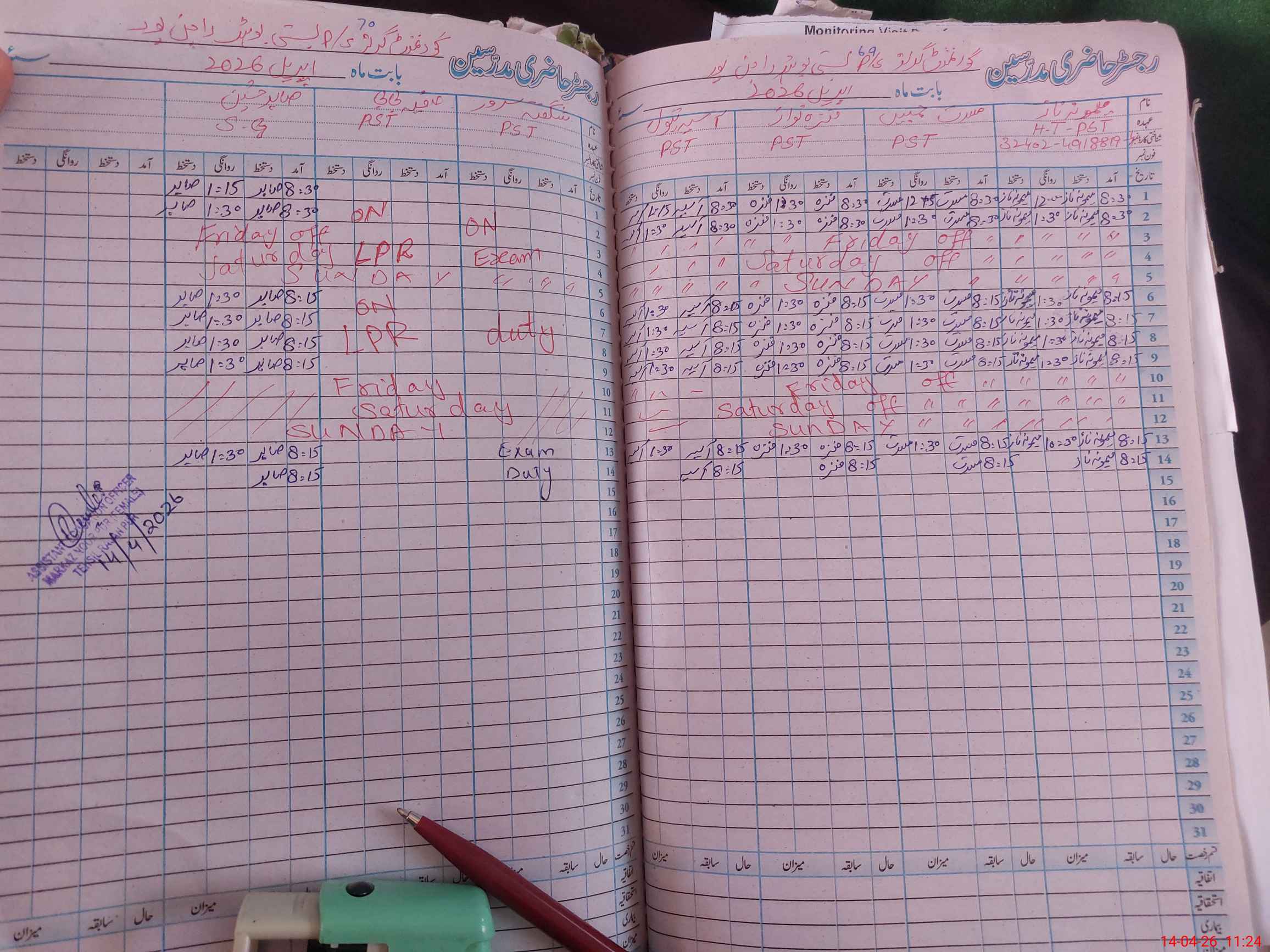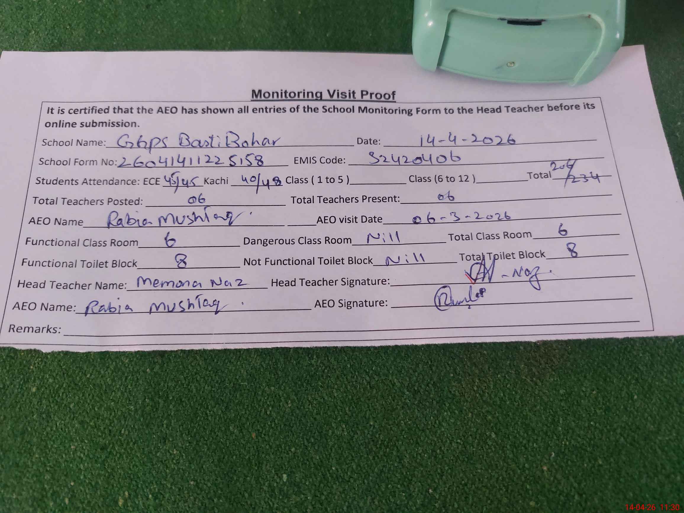 | Attendance Register | Head Teacher | MEA with School | Visit Proof |