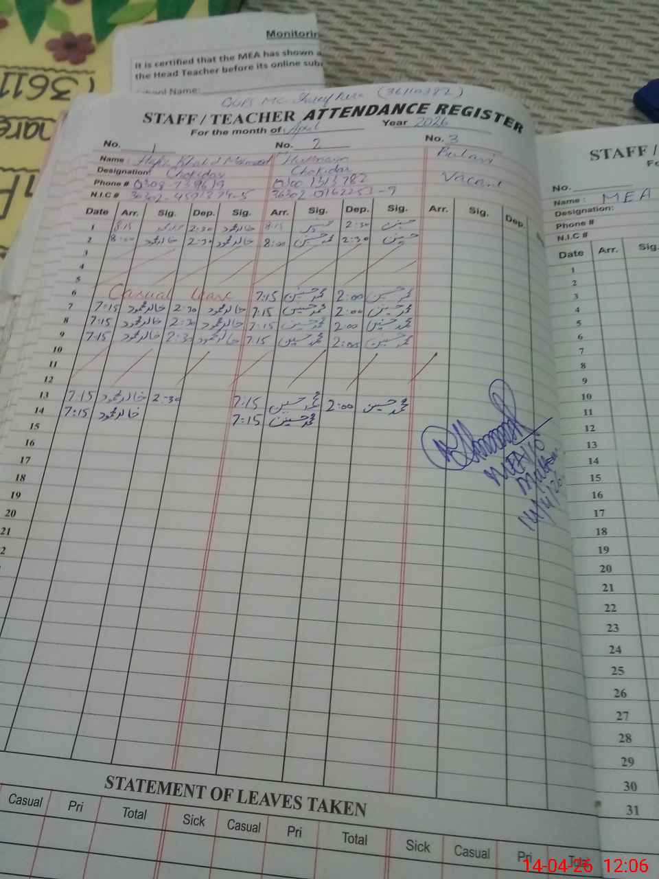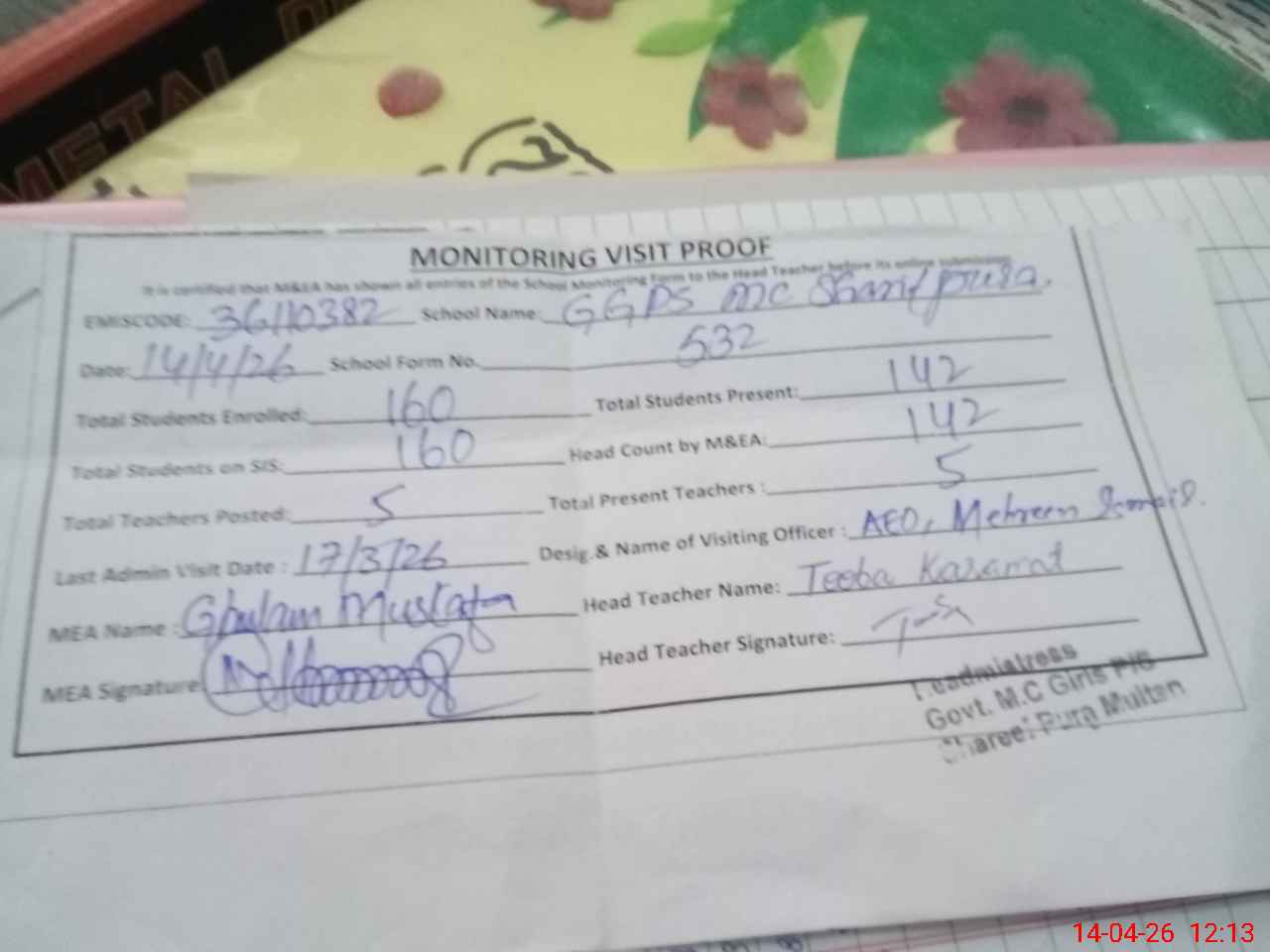 | Attendance Register | Head Teacher | MEA with School | Visit Proof |