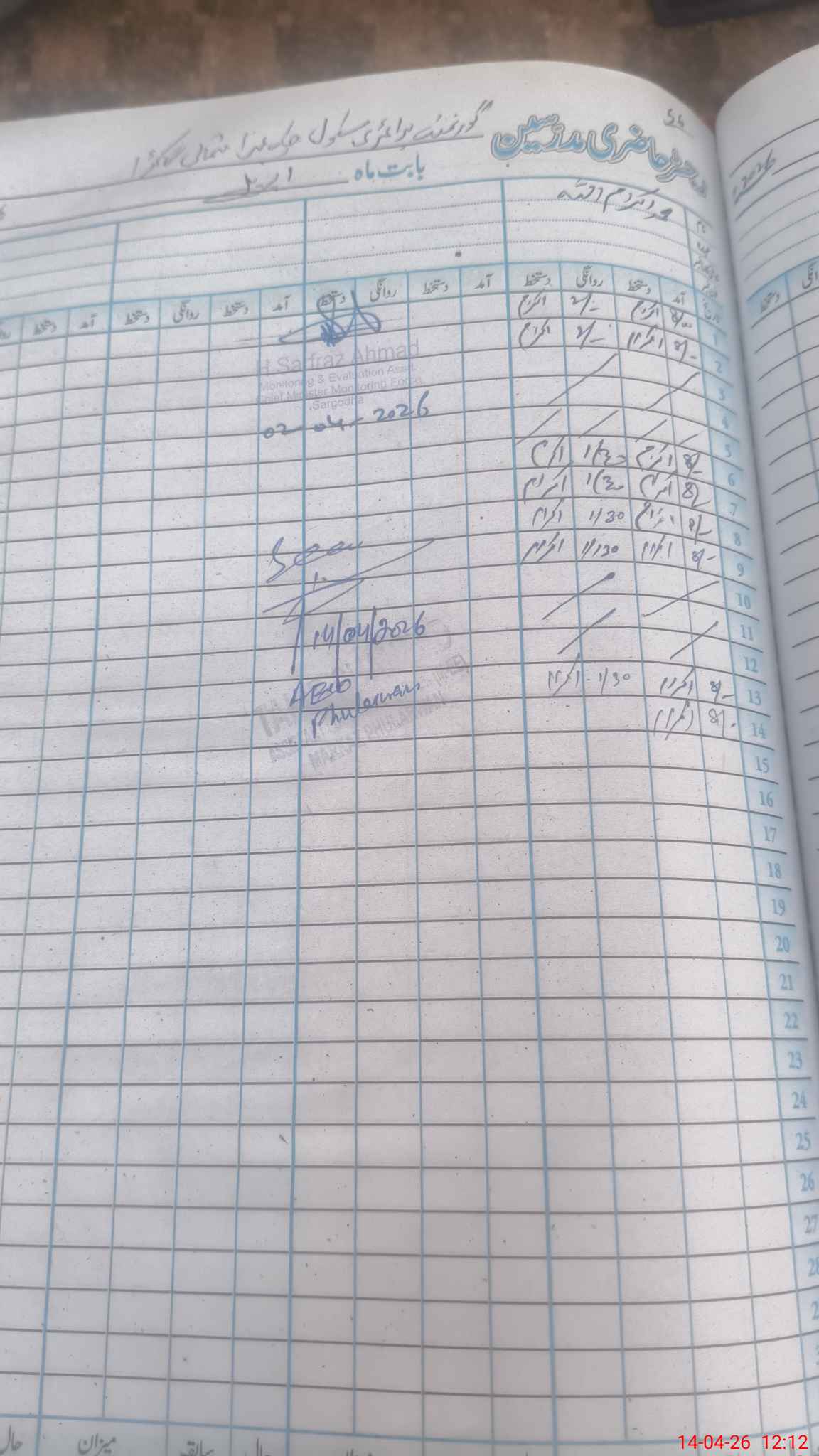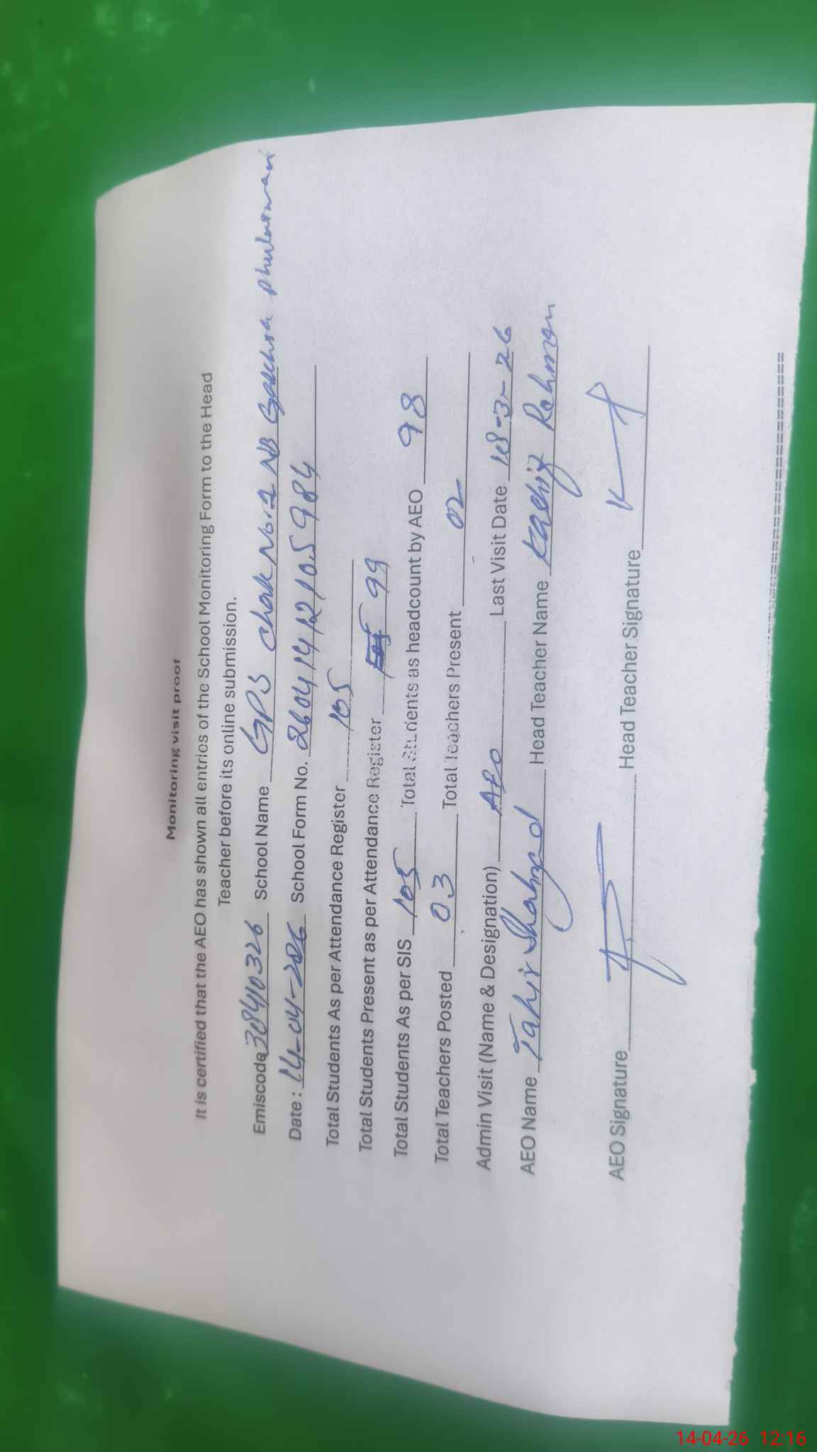 | Attendance Register | Head Teacher | MEA with School | Visit Proof |