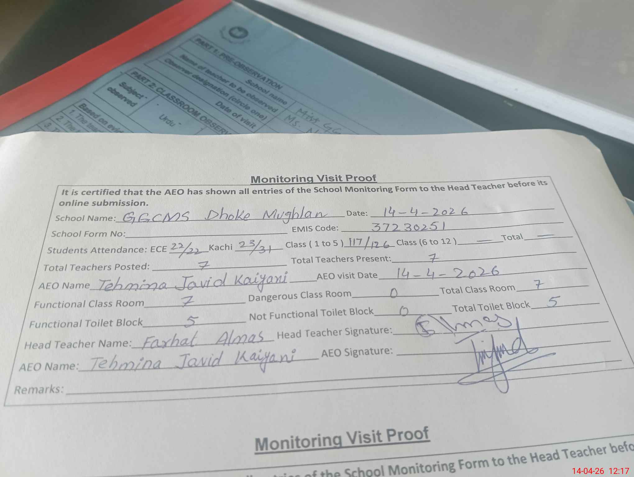 | Attendance Register | Head Teacher | MEA with School | Visit Proof |
