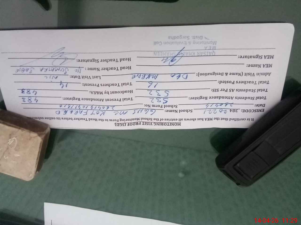 | Attendance Register | Head Teacher | MEA with School | Visit Proof |