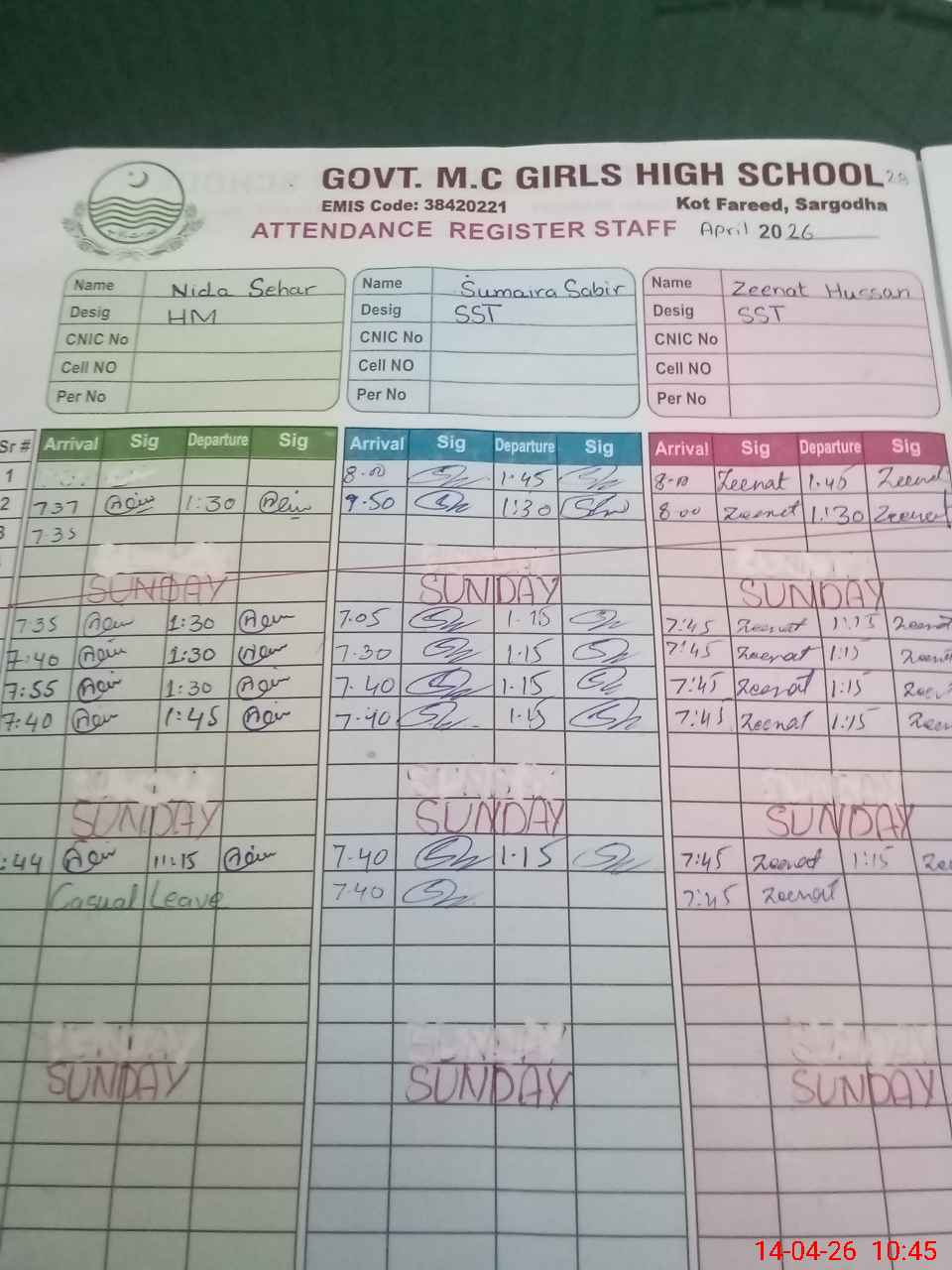 | CNIC | Full Name | Designation | R/C | Absence During Last Calender Month |