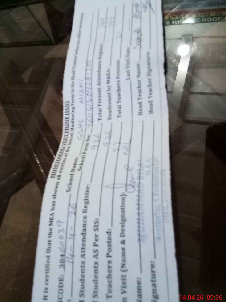 | Attendance Register | Head Teacher | MEA with School | Visit Proof |