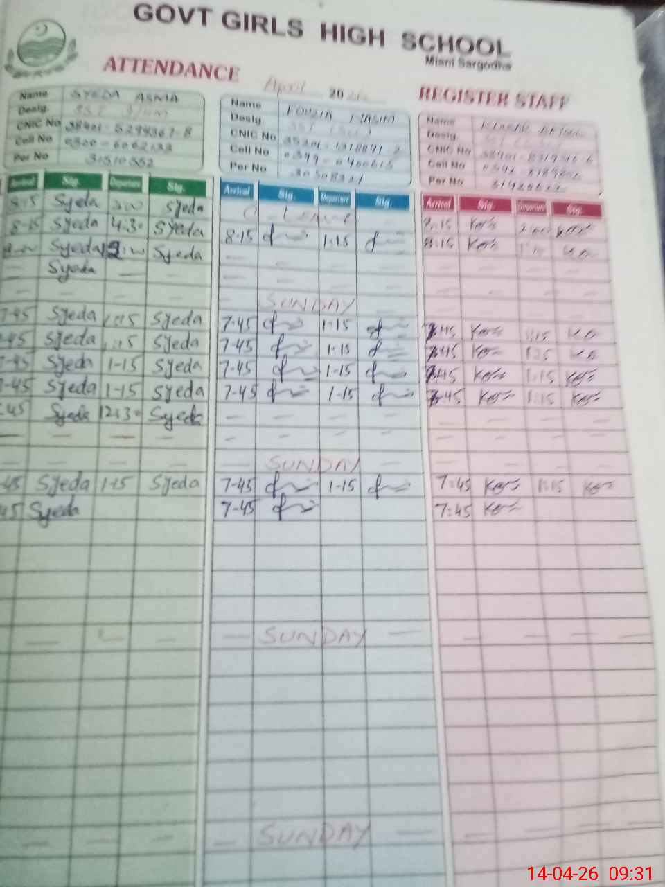 | CNIC | Full Name | Designation | R/C | Absence During Last Calender Month |