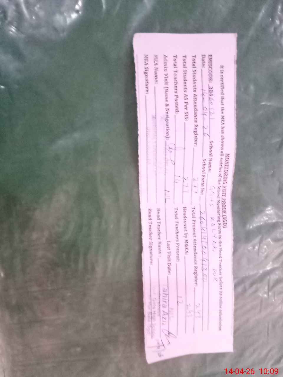 | Attendance Register | Head Teacher | MEA with School | Visit Proof |