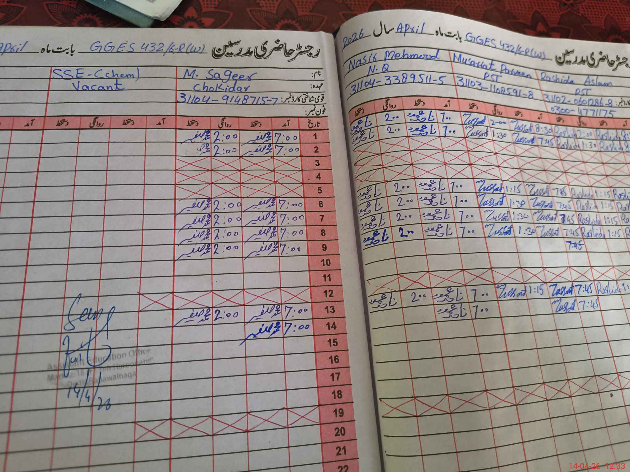 | Name: Sh**** Pe**** Designation: (School Headmaster's/Headmistress's) EST Phone/Cell Number: 03**** |