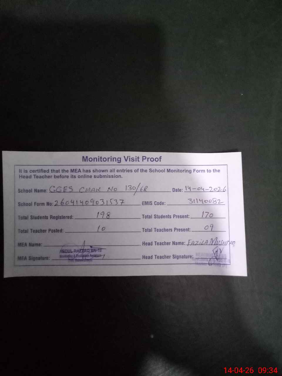 | EMIS Code: 31140082 | Name of School: GGES CHAK NO 130/6-R | |||