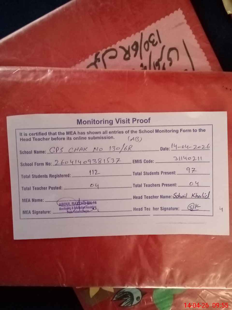 | EMIS Code: 31140211 | Name of School: GPS CHAK NO 130/6-R AB | |||