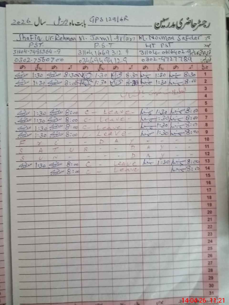 | CNIC | Full Name | Designation | R/C | Absence During Last Calender Month |